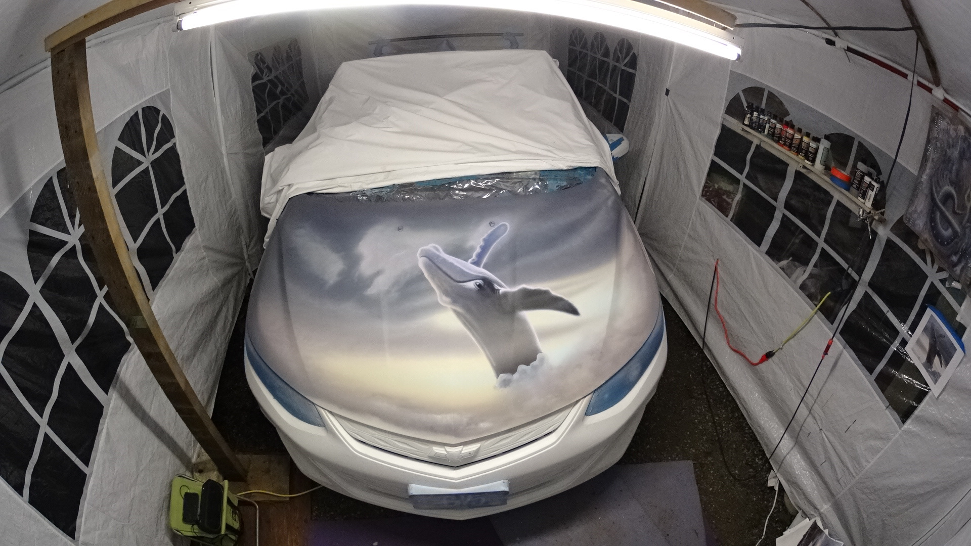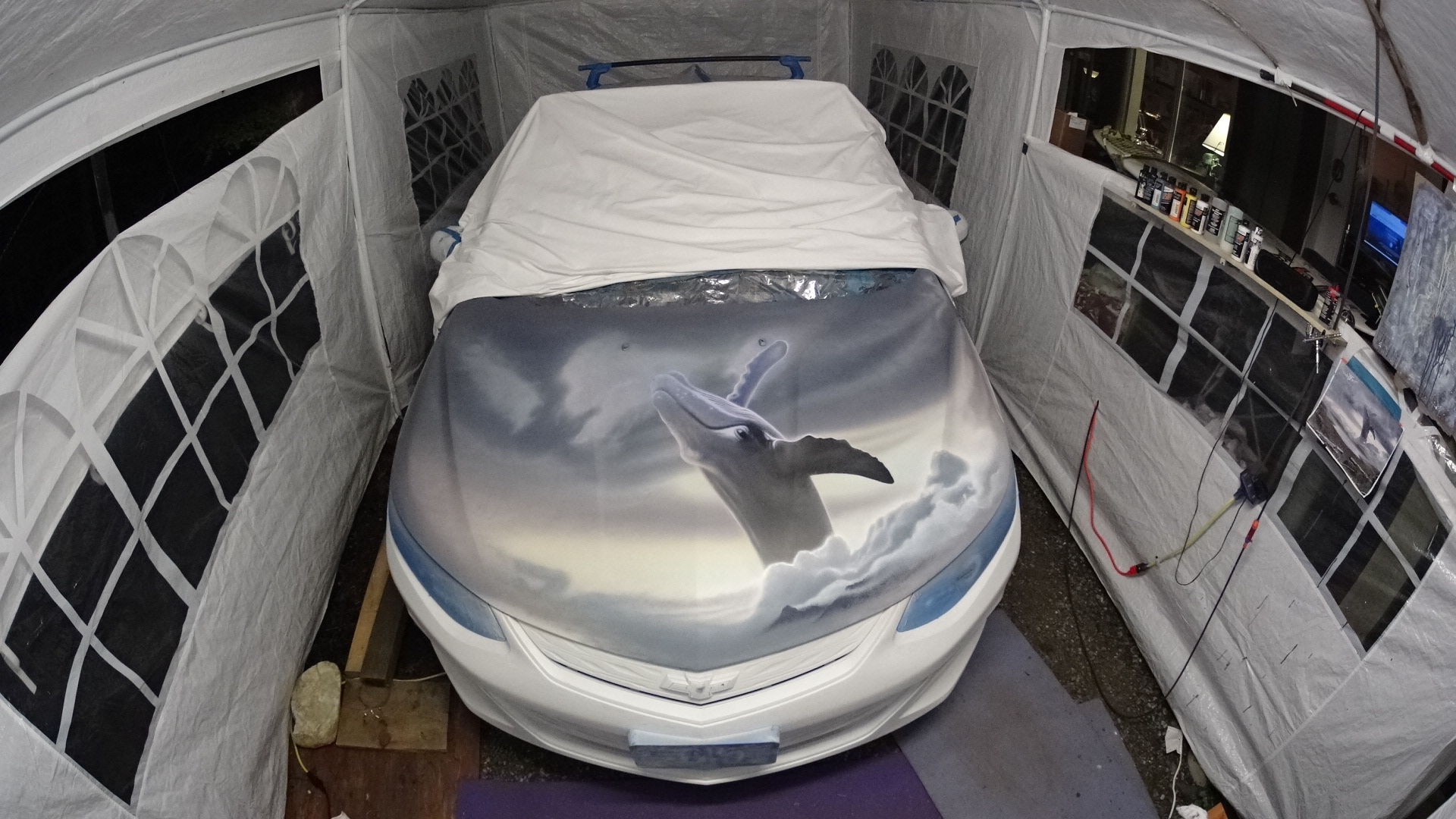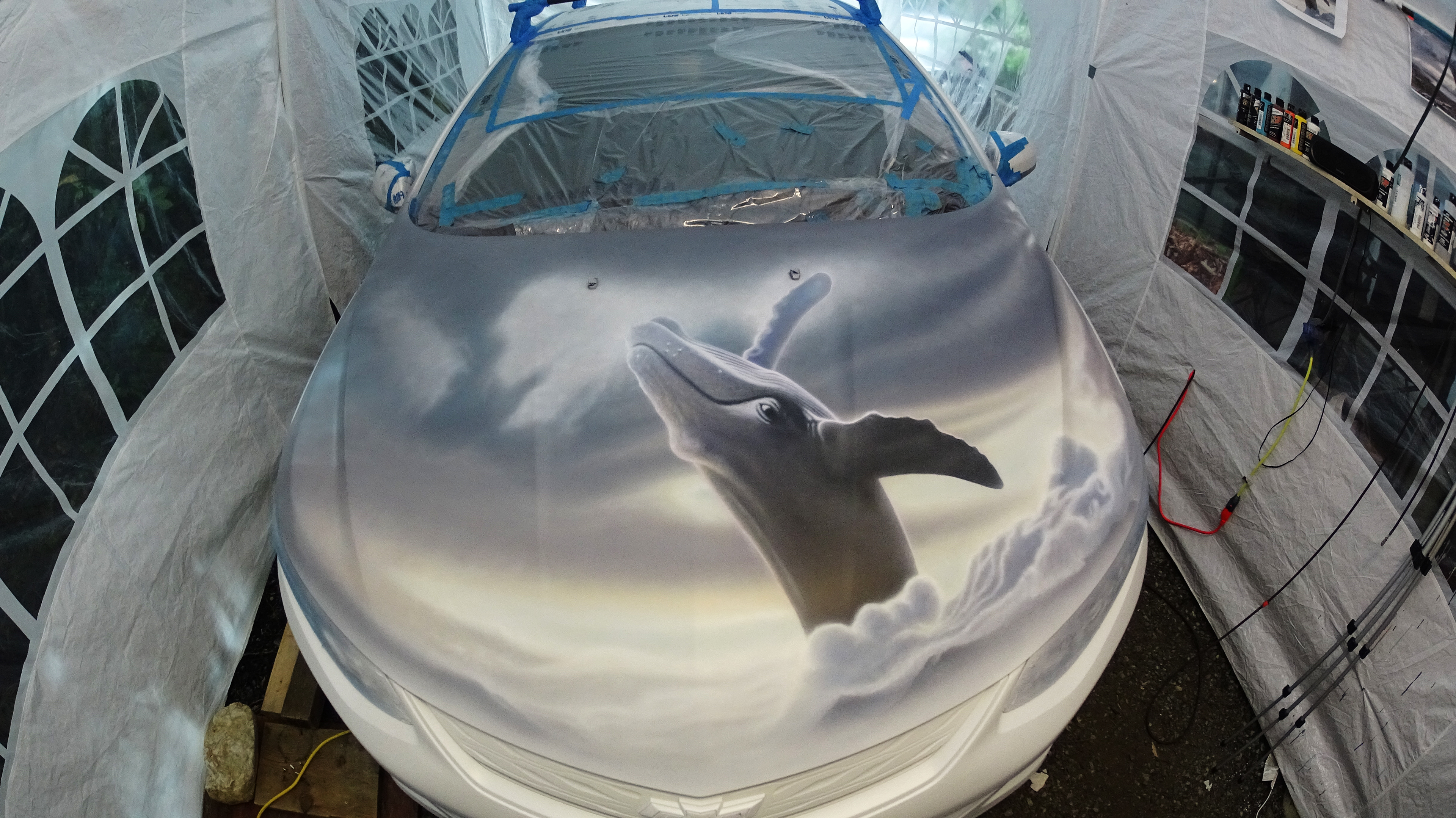 Airbrushing the hood of a car